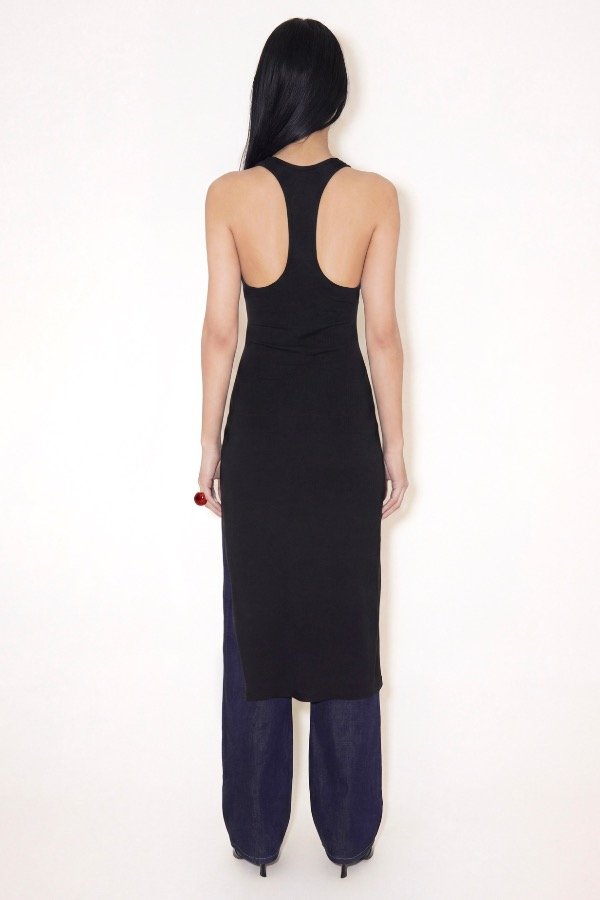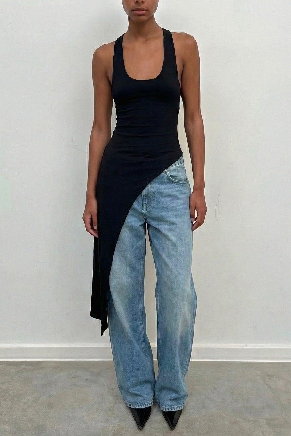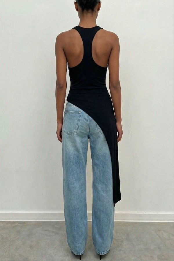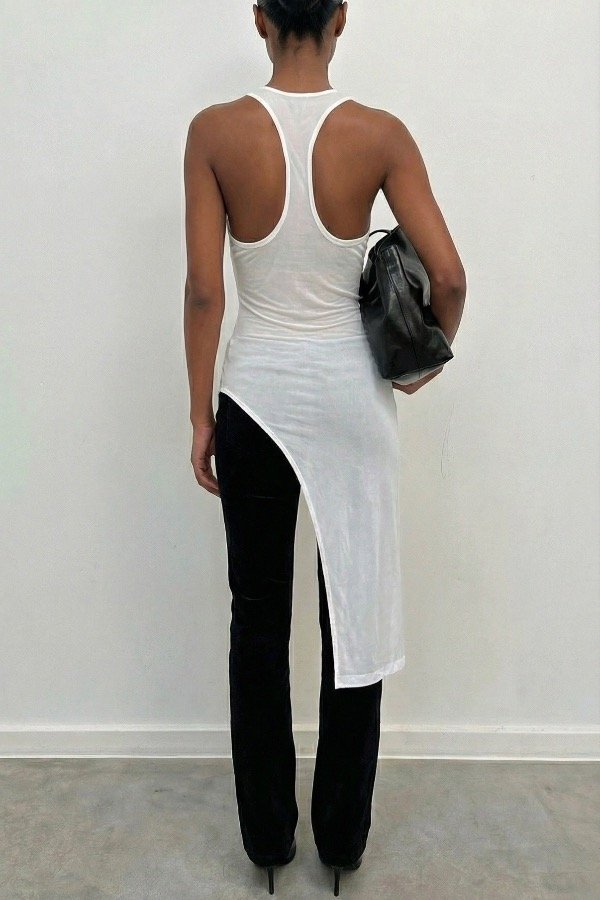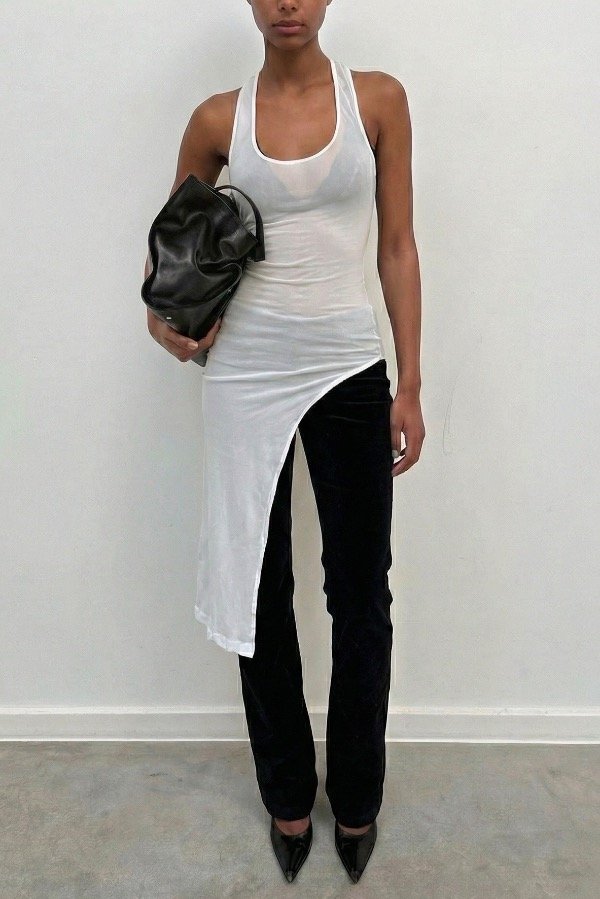 En la musculosa blanca la modelo lleva por debajo un corpiño nude evitando la transparencia de la tela. La musculosa negra no presenta tanta transparencia